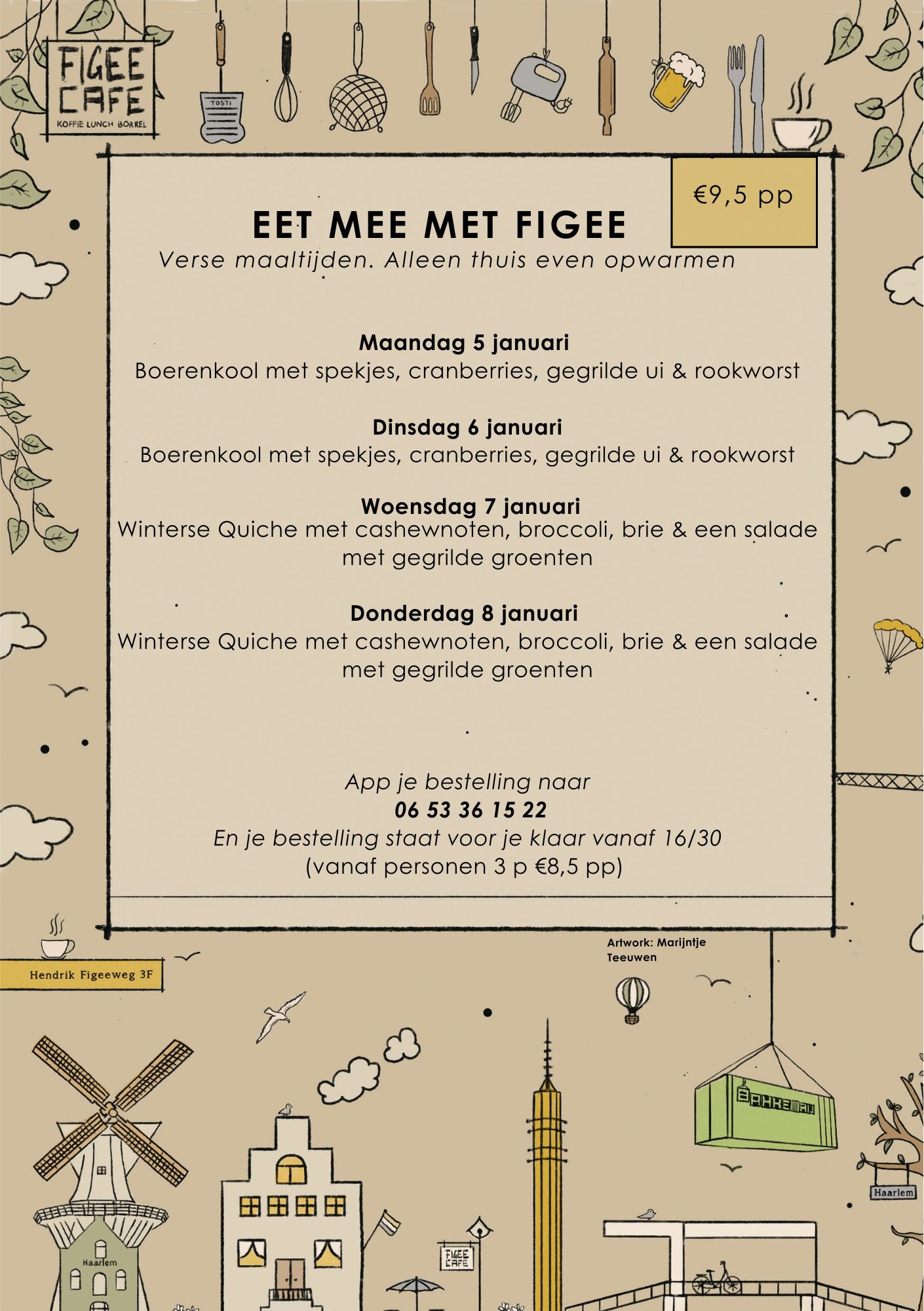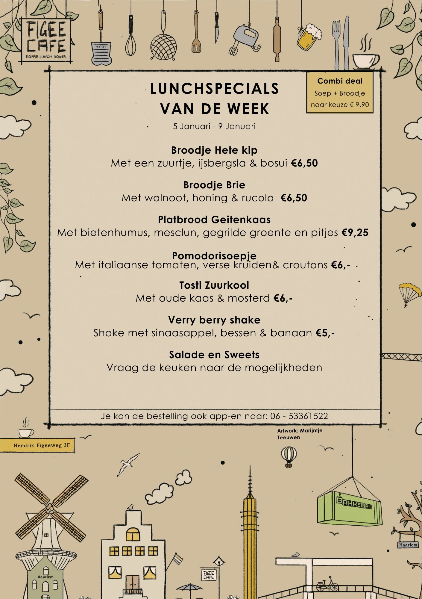 Het Figee Café bevindt zich in een loods: bedrijfsverzamelgebouw De BakkeRij. Alles dat op het menu staat kan je ook meenemen (En lunches voor groepen bezorgen we ook). Ook verzorgen we dagelijks lunch voor bedrijven en bieden we verrassende arrangementen voor vergaderingen of grotere groepen. Het mag natuurlijk nooit gaan vervelen. Daarom hebben we iedere week een heel menu aan nieuwe opties. Zie onderstaand het menu van deze week.